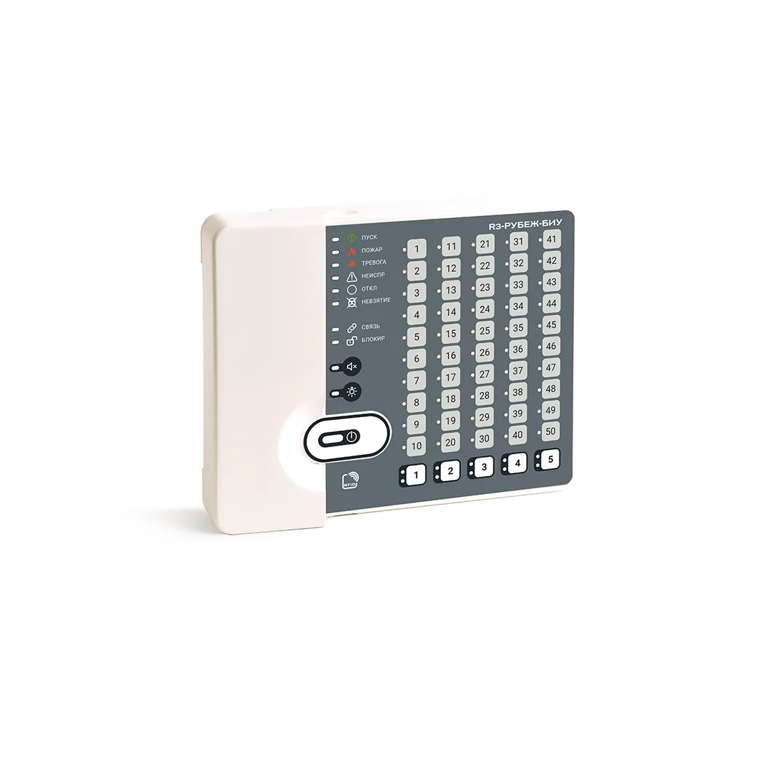 Блок индикации и управления R3-Рубеж-БИУ предназначен для сбора информации с приемно-контрольных приборов R3-Рубеж-2ОП или контроллера адресных устройств R3-Рубеж-КАУ2 и отображения состояния зон, групп зон, исполнительных адресных устройств на встроенном светодиодном табло, а также управления охранными зонами, пожарными зонами и исполнительными адресными устройствами.
